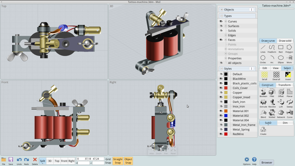 Tattoo machine, made with Blender from a real model, the 3D model was exported and remade with Moi3D and it is available in different formats which are: